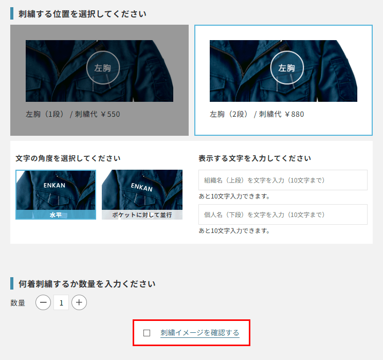 商品ページの「刺繍購入」ボタンから進み、下記をご指定いただけます。